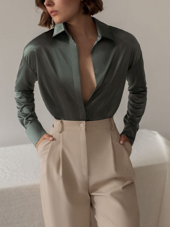 Сорочки з шовку, атласу та сумішевих тканин чудово вписуються в концепцію популярних стильових напрямків останніх років. Таких, як мінімалізм, old money та «тиха розкіш». Ніжні, струмуючі шовкові сорочки будь-якій жінці додадуть розкоші і дещицю загадковості. Цю модель можна використовувати для вечірнього виходу або носити щодня: шовк або атлас зроблять вишуканішим навіть найпростіший офісний образ.