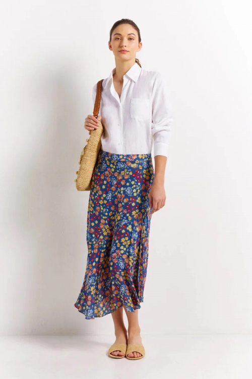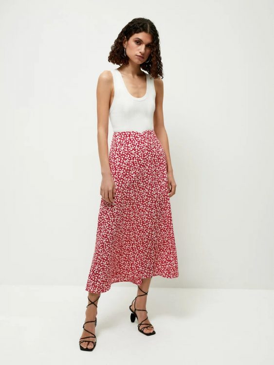 Найбільш популярна модель спідниці з квітковим принтом має трохи розкльошений силует, пошита з шовковистої тканини і м’яко облягає стегна. А ось спідниці крою “баба на чайнику” з веселеньких ситців із трьома ярусами зараз зовсім неактуальні.
