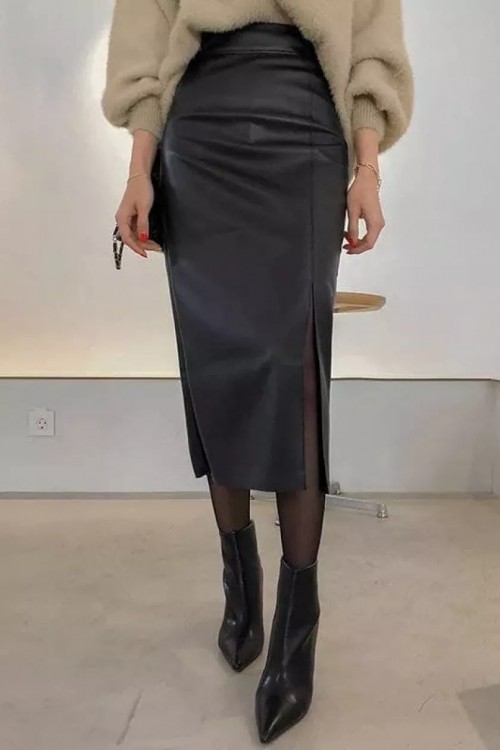 Спідниці зі шкіри в довжині міді можуть бути прямого силуету або навіть трішки розкльошені. Також із нами залишаються спідниці на запах.
