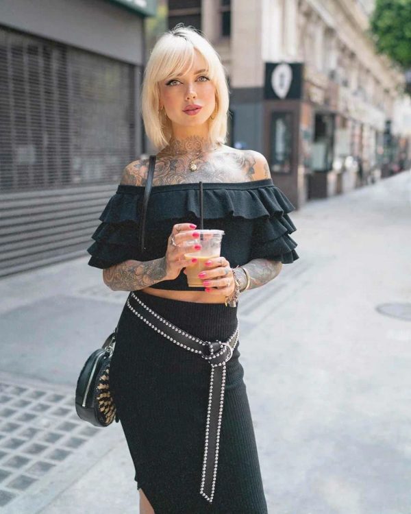 Піксі з рівним густим чубчиком виглядає сучасно і гармонійно, як з сукнями, так і зі спортивними костюмами. При цьому, жіноча зовнішність набуває абсолютно нового вигляду, привертаючи до себе увагу всіх оточуючих.