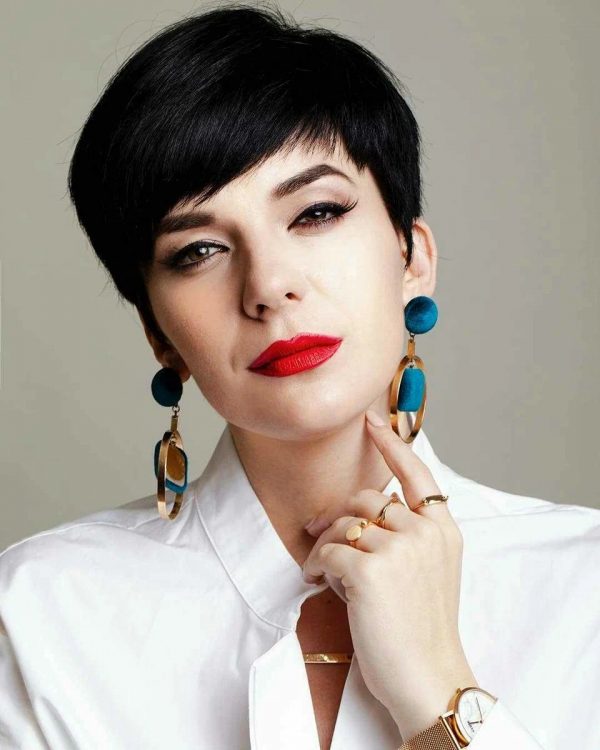 Модна стрижка піксі з довгим рваним чубчиком підійде модницям, які хочуть виглядати молодшими, мати більш підтягнутий овал обличчя. Зверніть увагу, що на даній довжині волосся за допомогою брашингу, лаку для волосся та фена можна створити неймовірної краси об’єм від самого коріння, який протримається до наступного миття.