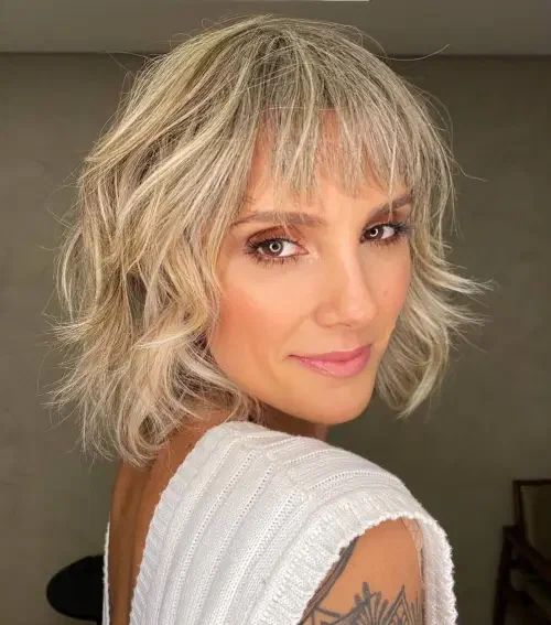 Романтична, жіночна зачіска – чудовий вибір, щоб зробити вас молодшими. Ця стрижка довжиною до плечей із непостійними шарами волосся та тонким чубчиком – втілення легкості, а м’які пляжні хвилі допомагають зробити її неймовірно жіночною.