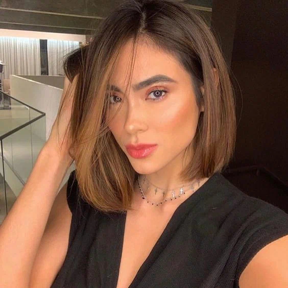 Стильний і витончений long bob з чубчиком та рівним зрізом – стрижка, яка подарує почуття впевненості у собі дамам будь-якого вікового діапазону. Довжина волосся, що закінчується на рівні підборіддя, візуально може повнити обличчя, а ось подовжені передні пасма навпаки нейтралізують цю оманливу картинку.