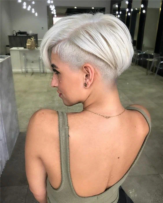 Фарбування тотал блонд набирає все більших і більших обертів з кожним новим сезоном. Перед вами наочний приклад зухвалої та ультрамодної стрижки “боб” з поголеною скронею і косим проділом.
