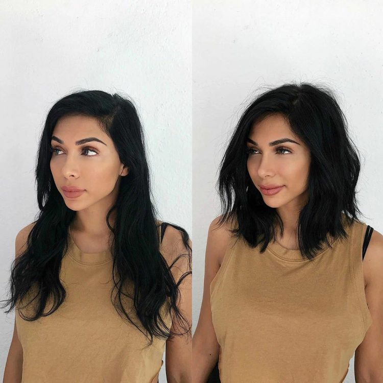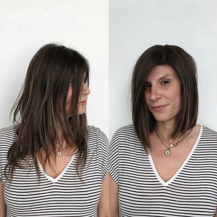 Стрижка середньої довжини з подовженими передніми пасмами і прямим проділом – модна модель стрижки, яка візуально молодить зовнішність і робить волосся охайним і доглянутим.