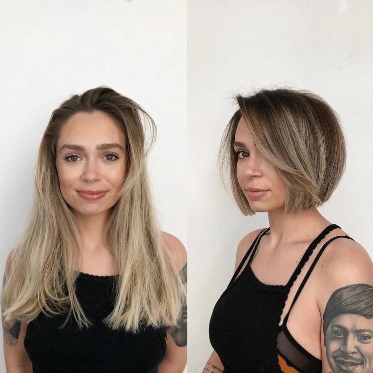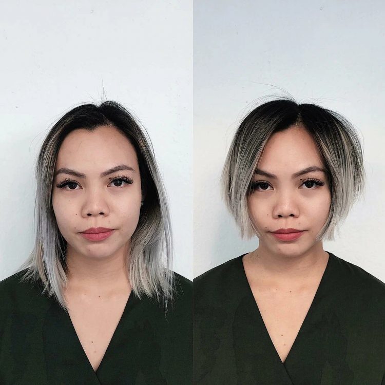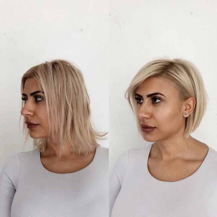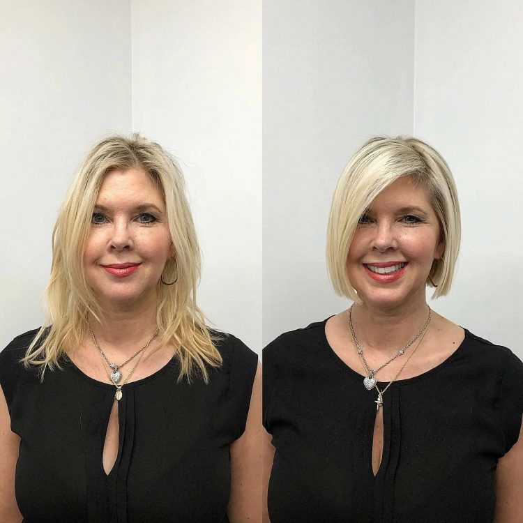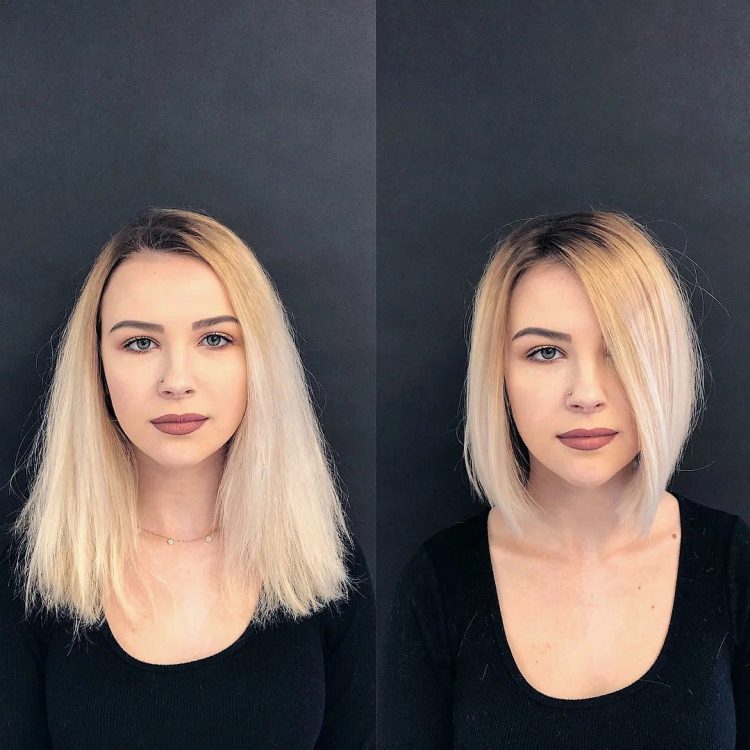 Це ще один наочний приклад, як короткі сучасні варіанти стрижок візуально змінюють та молодять жіночу зовнішність. Косий проділ робить форму обличчя витонченою та елегантною.