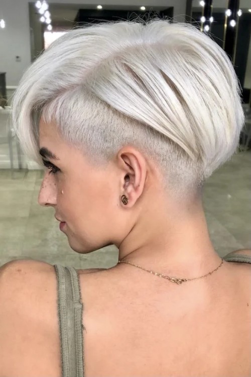 Ультракоротка піксі з поголеними скронями і довгим косим чубчиком – фешн стрижка, яка зробить образ молодшим і сучаснішим. Такого плану стрижка підійде жінкам, як з густим, так і з тонким волоссям.