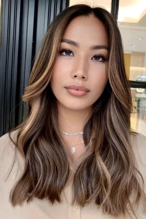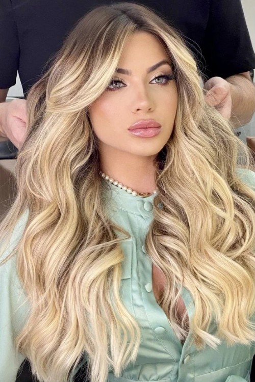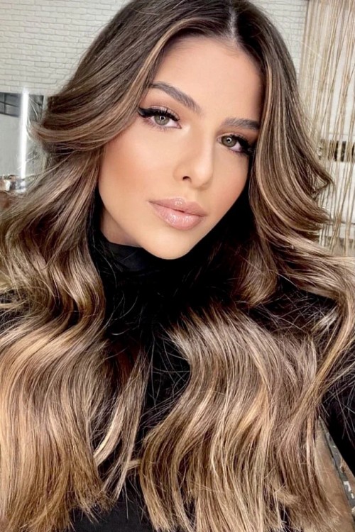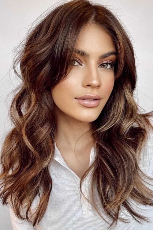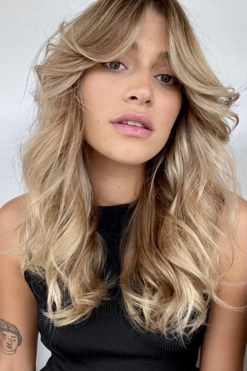 Чудова сучасна модель чубчика «шторки» максимально гармонійно перегукується як з короткими, так і з довгими стрижками. Перед вами жіночний варіант зачіски, яку прикрашають хвилясті пасма, чубчик, в даному випадку, чудово доповнює собою образ. Подовжені пасма з боків з ефектною драбинкою виглядають максимально вдало.