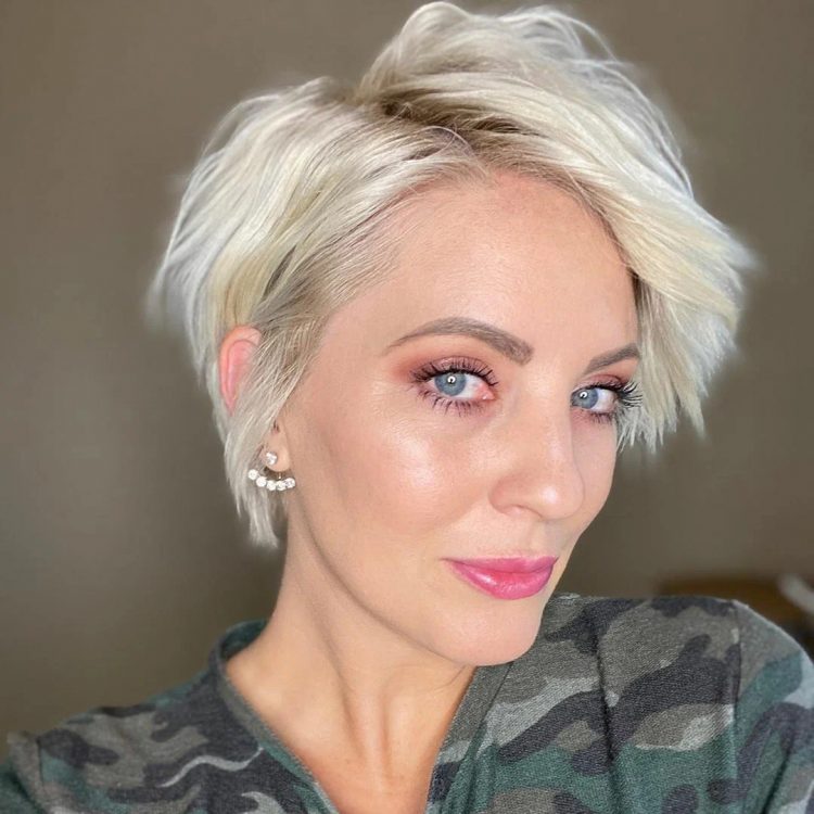 Наступна стрижка являє собою ультракоротку піксі з філірованою маківкою та укороченою потиличною частиною. Дана модель чудово підійде не тільки зрілим красуням але й тим жінкам, які хочуть перетворити своє тонке волосся на більш об’ємну шевелюру.