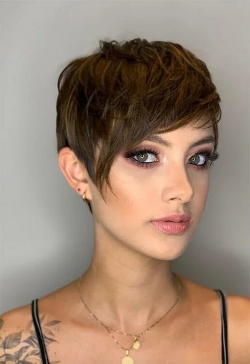Дівчатам з густим волоссям і незграбними рисами обличчя краще зробити вибір на користь короткої стрижки. Піксі з чубчиком – вдалий варіант, якщо у вас овальна форма обличчя.