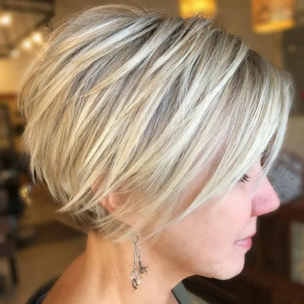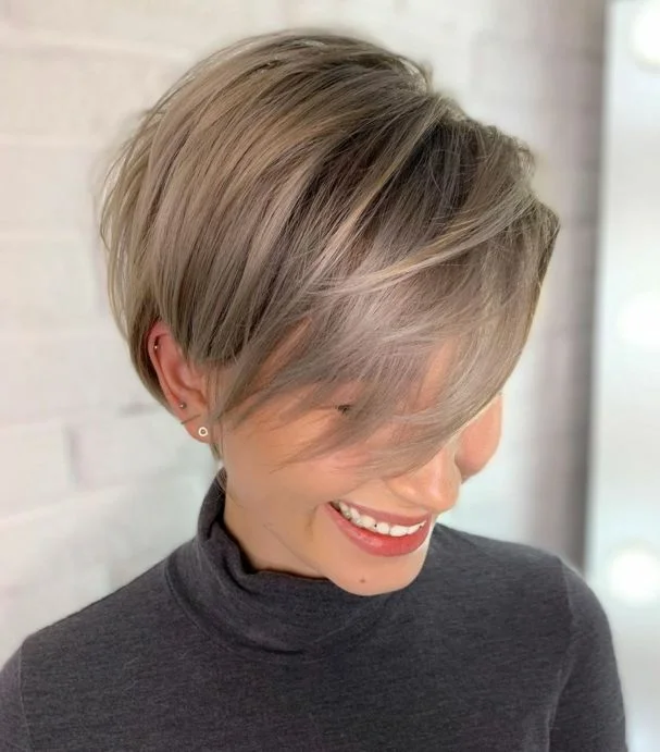 Ще коротше? Тоді як щодо такого піксі-бобу? На тонкому м’якому волоссі ця стрижка виглядає приголомшливо! Завдяки шарам, формі стрижки і льняному блонду створюється відчуття, що волосся насправді набагато більше.