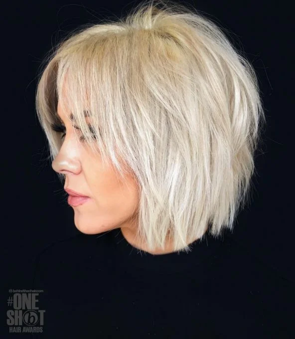 Чудовий м’який боб із шаруватою потилицею і довгим чубчиком. Це та сама стрижка, яка легким рухом прибере з вашого обличчя “зайві” роки.