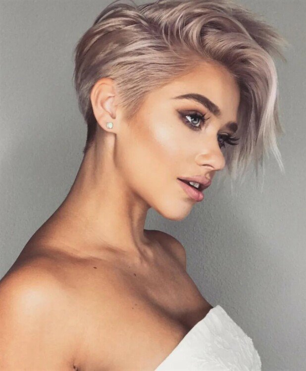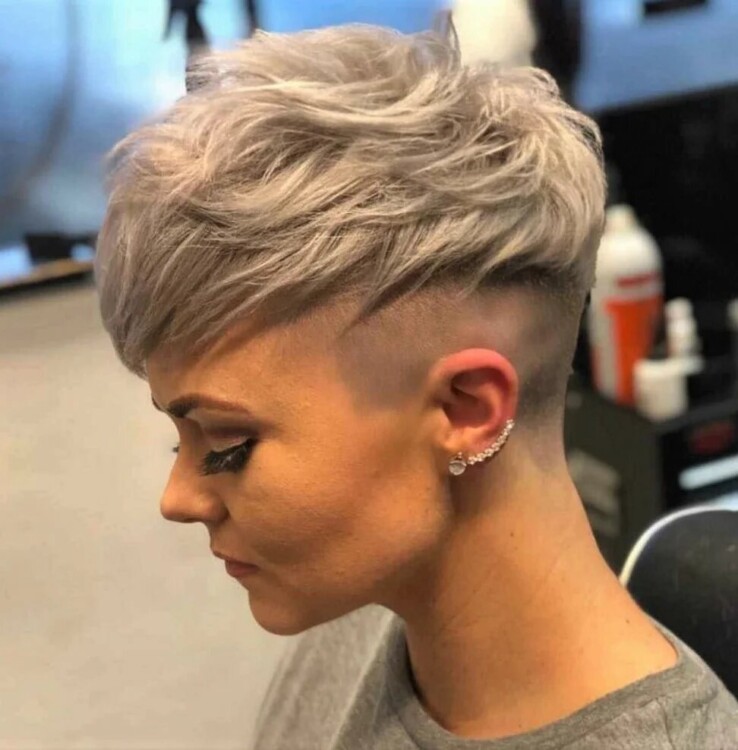 Для створення представленої зачіски відмінно підійде стрижка боб, а також піксі. Основною особливістю зачіски є виголені скроні, завдяки чому стрижка виглядає неймовірно сміливо і зухвало. Саме тому ця стрижка ідеально підійде тим дівчатам, які люблять створювати більш екстравагантні образи.