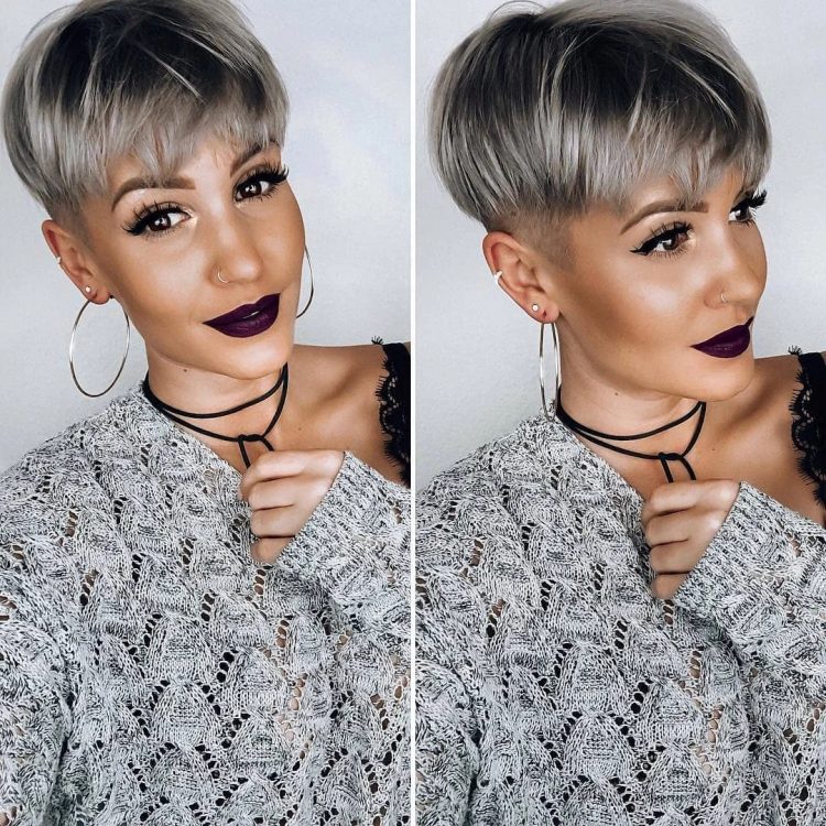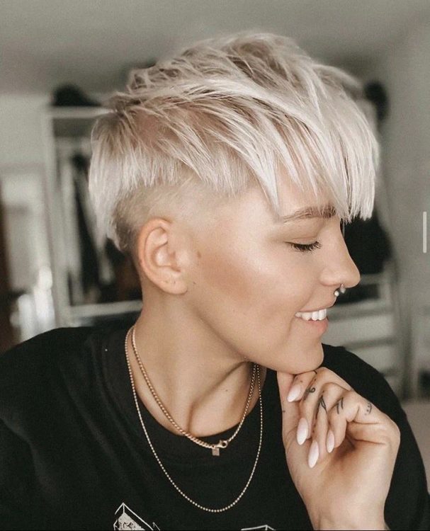 Піксі з поголеними скронями і довгим прямим чубчиком – модель стрижки, яка поза всяким сумнівом привертає до себе увагу. У цьому й полягає її виграшна сторона.