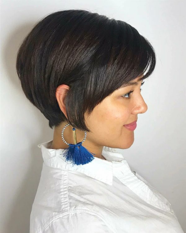 Рівний боб із градуйованим чубчиком – мінімалістичний варіант жіночної стрижки, який вибирають модниці різного вікового діапазону.