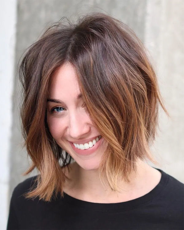 Пасма в багатошаровому бобі мають різну довжину. За рахунок цього зачіска здається ніби скуйовдженою, а головне — об’ємною навіть на тонкому волоссі. Чубчик-шторка або багатобарвне фарбування (омбре, шатуш, брондування) тільки посилять цей ефект. Роблячи укладання на стрижці боб, можна залишати волосся прямим або створювати легкі хвилі.