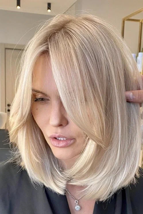 Хвиляста стрижка середньої довжини + чубчик-шторка – поєднання для жінок, які знаються на сучасній моді. Крім того, що ця стрижка робить образ стильним і сучасним, вона також візуально додає шевелюрі густоти та прикореневого об’єму.