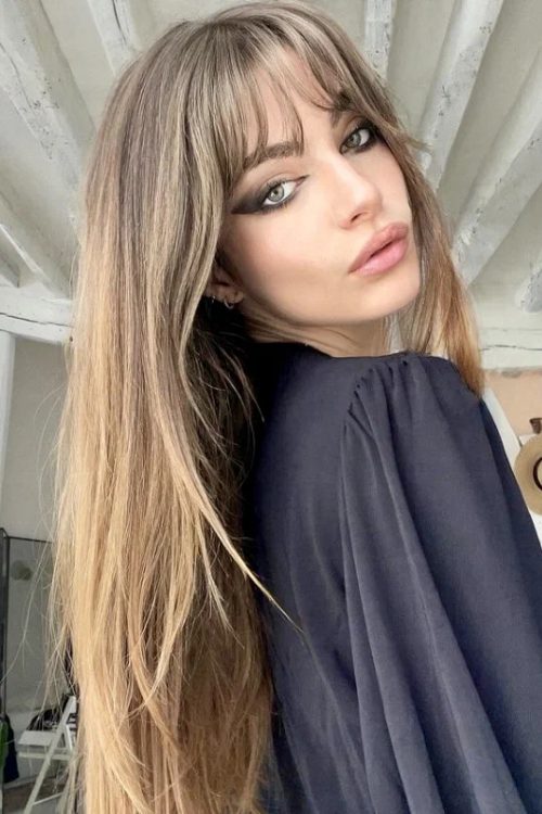 Наступний «гарячий» тренд — чубчик «півмісяць» із градуйованими кінчиками. Він візуально молодить і робить зовнішність ефектнішою, а форму обличчя стрункою і витонченою. Цей варіант чубчика чудово перегукується з довгим рівним волоссям і драбинкою біля обличчя.
