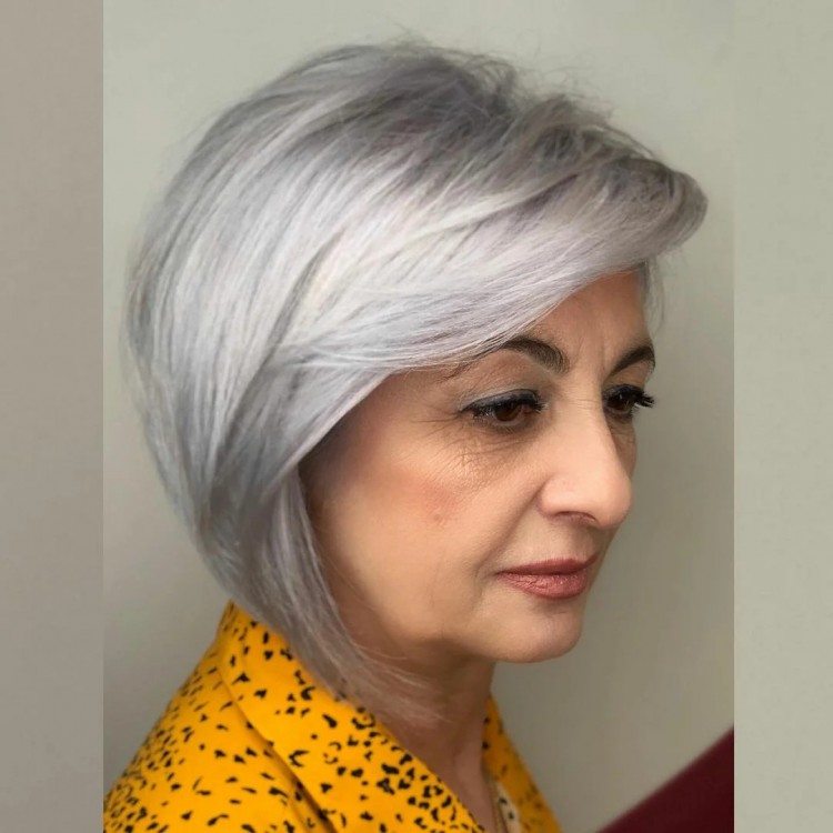 Стрижка боб користується неймовірною популярністю у жінок віком 60+. Це пояснюється тим, що структура їхнього волосся залишає бажати кращого. Стрижка боб здатна надати зачісці додаткового об’єму, зробити шевелюру візуально густішою. Косий чубчик, що прикрашає боб, легко вкладається, не завдаючи особливих клопотів жінкам, і надає своєрідного шарму.