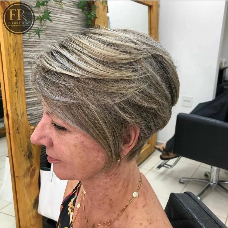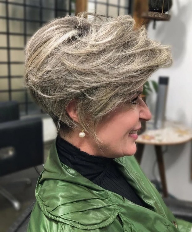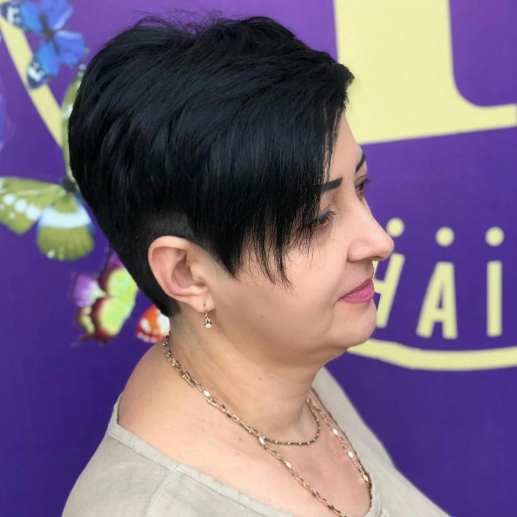 Якщо жінка зрілого віку вирішила кардинально змінити свій вигляд, то правильним вибором стане модна стрижка піксі. Вона приваблює тим, що надає пікантності образу, освіжає його, робить динамічним. Важливим є і той факт, що догляд за зачіскою не потребує салонного втручання. Косий чубчик акцентує увагу на собі, відволікаючи сторонні погляди від вікових змін шкіри.