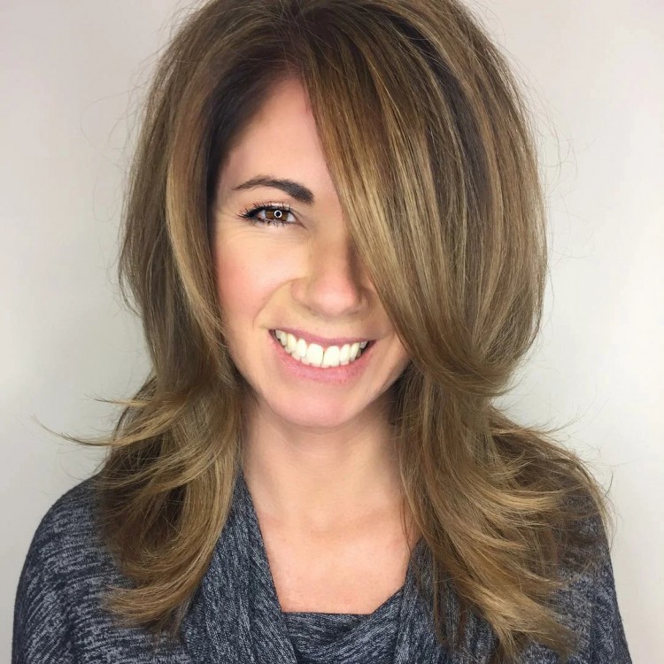 Багатошарові стрижки зроблять образ літньої жінки розкішнішим. Дами виглядають більш жіночно та привабливо. Стрижка універсальна: пасує жінкам з будь-яким типом обличчя та структурою волосся. Підсилити ефект омолодження дозволяє подовжений профільований косий чубчик.