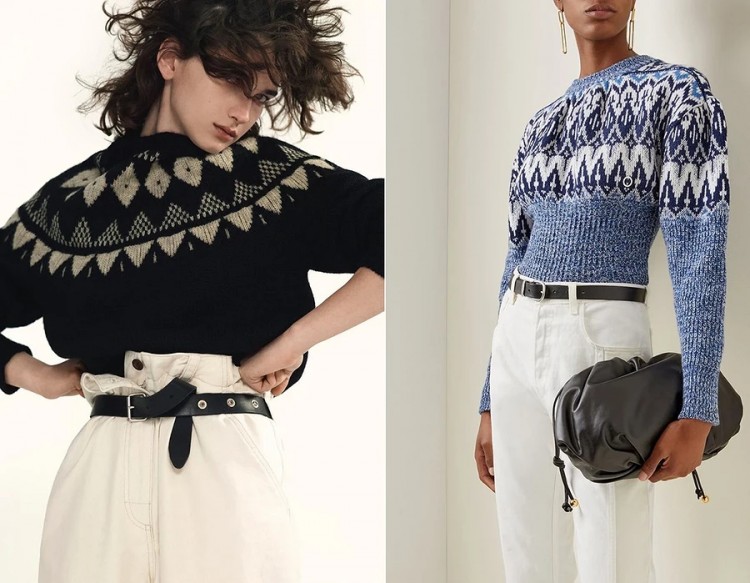 Ретро-тренд, що набуває найнезвичайніших форм — тут і мінімалістичні абстракції, і куди складніші композиції, часом доповнені вишивкою. Багато стилістів рекомендують врівноважувати такі светри строгими спідницями та штанами, а також доповнювати виразними прикрасами. Джинси, звичайно, теж підійдуть в ролі компаньйону, образ вийде дуже домашнім і затишним.
