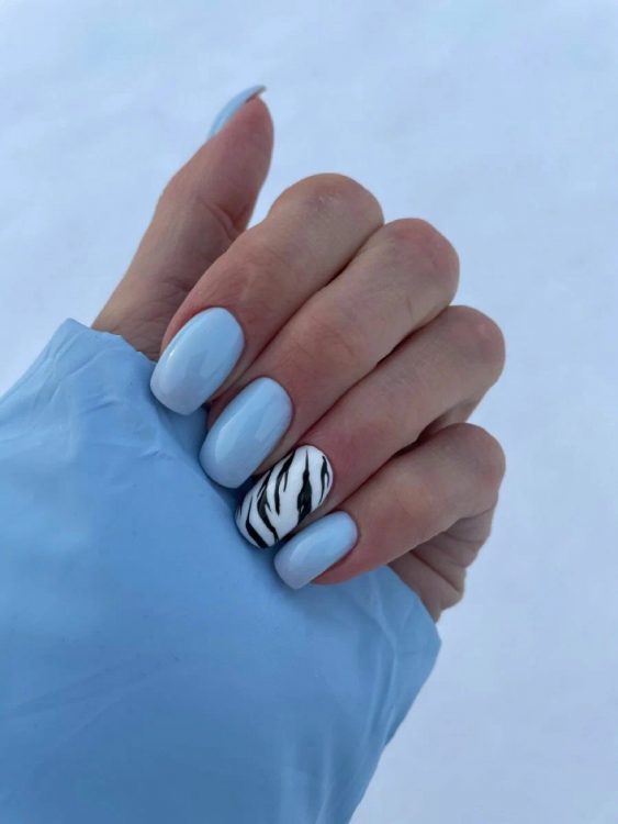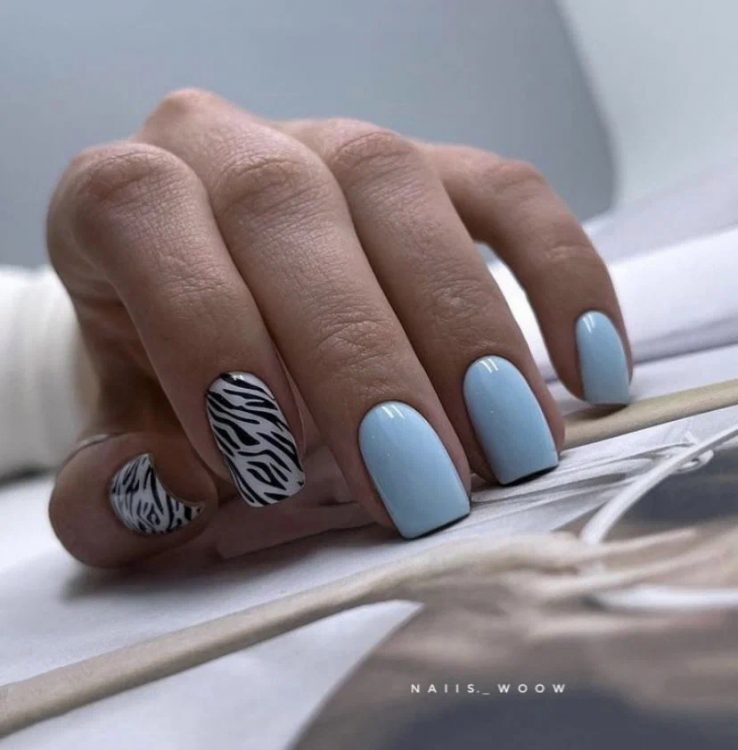 Блакитні відтінки чудово поєднуються з анімалістичним зебровим принтом. Його можна зробити на 1-2 нігтях. Такий манікюр виглядає стильно, цікаво та оригінально.