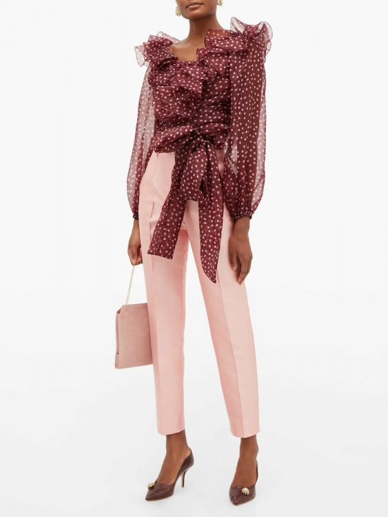Перша модель блузи виконана з невагомої, напівпрозорої тканини та прикрашена об’ємними рюшами, а також воланами. Зверніть увагу, що на піку популярності в 2023 будуть принтовані моделі.