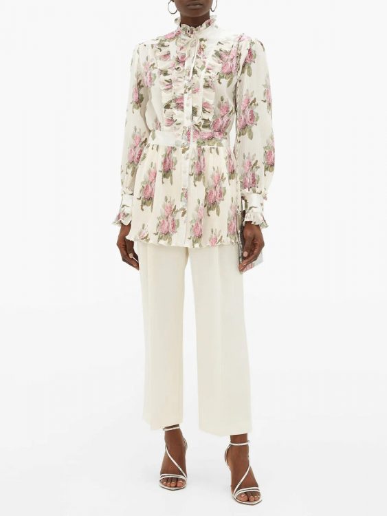 Подовжена блузка в дрібний квітковий принт допоможе приховати недосконалості фігури і підкреслити при цьому її переваги.