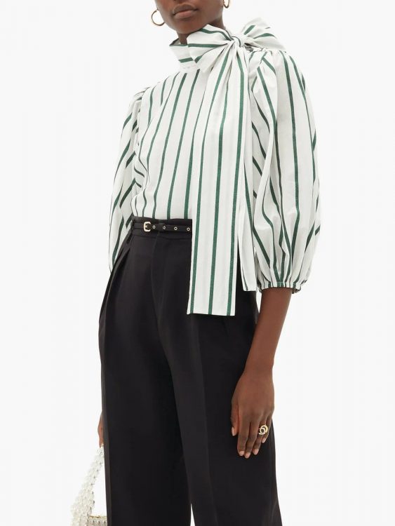 Смугасті блузки з бантом на шиї та укороченими рукавами-буфами виглядають дуже стильно і виразно. Вертикальні смужки візуально подовжують та роблять фігуру стрункішою.
