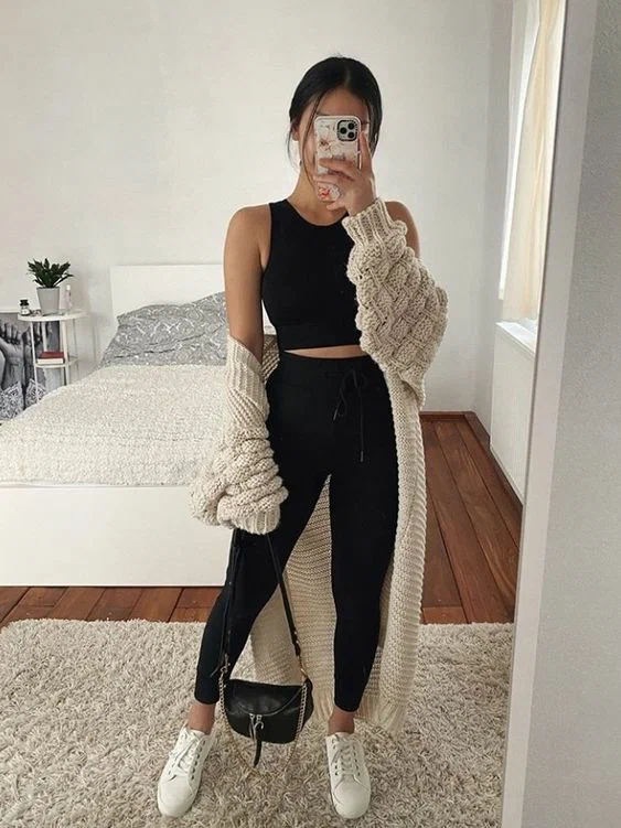 Наступна новинка сезону весна-літо 2022 – це шикарні довгі кардигани з виразними ажурними рукавами. Придивіться до наступного поєднання речей на щодень: довгий кардиган + лосини + топ + білі кросівки.