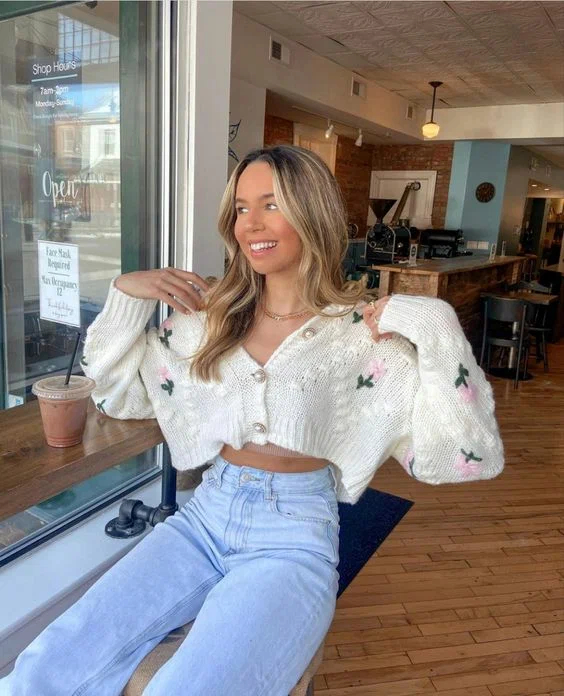 Бажаєте придбати кардиган, який додасть виразності та стилю вашим образам, зверніть увагу на короткі моделі з великої пряжі, прикрашені контрастною вишивкою.