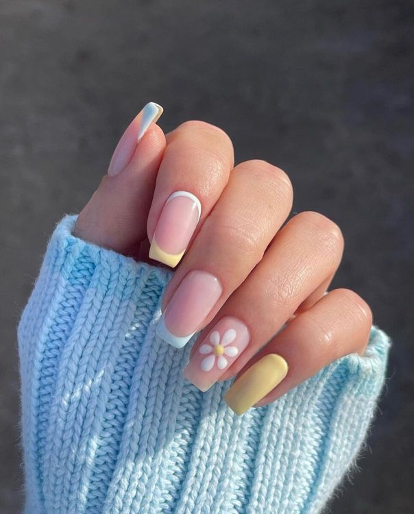 Трохи цікавіший варіант — зробити різнобарвний френч лише на кількох пальцях, а інші залишити однотонними. Також можна додати зворушливий дизайн у вигляді маргаритки або ромашки. Ще одна альтернатива — зробити френч із ніжним принтом. Наприклад, біло-бузкову шашечку. І не забувайте, що ви можете пробувати абсолютно різні форми «усмішки». Ну а щоб вам було простіше визначитися з вибором дизайну, у цій статті ми зібрали найкращі ідеї французького манікюру. Серед них ви знайдете свій ідеальний пастельний френч.