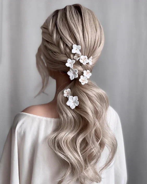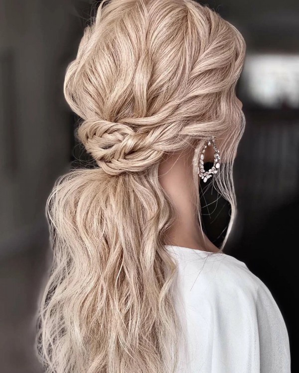 Хвіст з кількома переплетеннями + прикореневий об’єм + кілька розпущених пасм біля обличчя – ще одна проста у виконанні та елегантна зачіска, яка підійде як на кожен день, так і для особливої події.