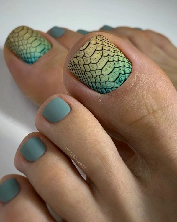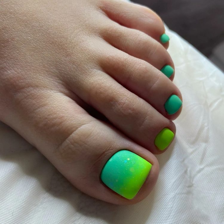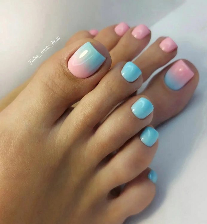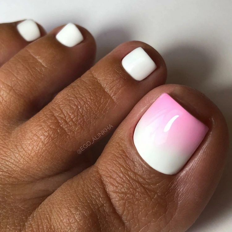 Звичайно, ефект градієнта на кожному нігтику на ногах може здатися складним, адже нігтьові ложа на пальцях ніг надто крихітні, щоб показати всю красу кольорових переходів. Тим не менше, ви необов’язково повинні робити однакові нігті на всіх пальцях ніг, як це заведено у випадку з манікюром. Ви можете прикрасити ефектом омбре лише великі пальці.