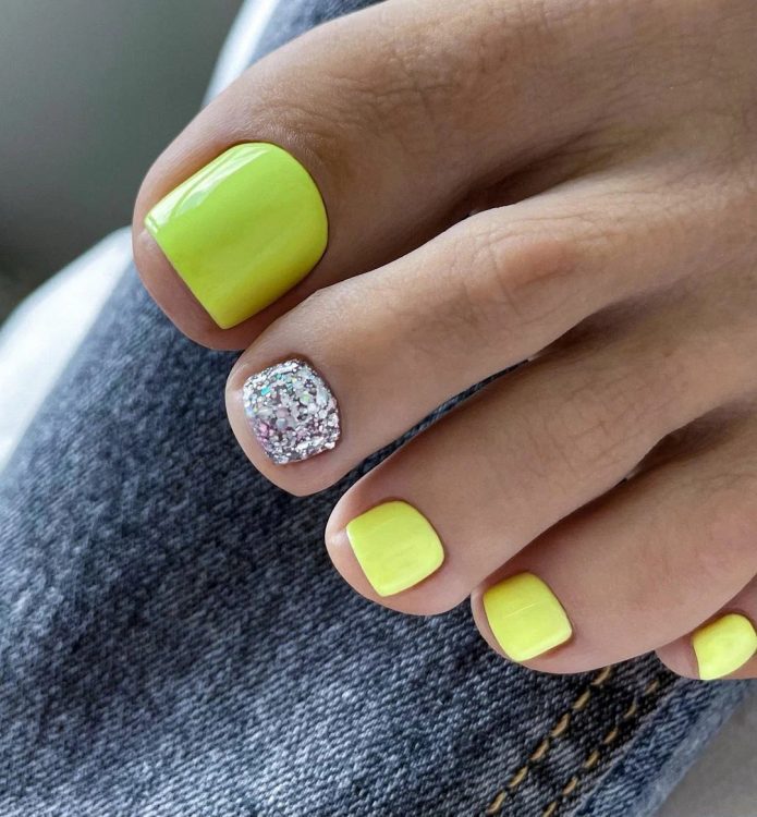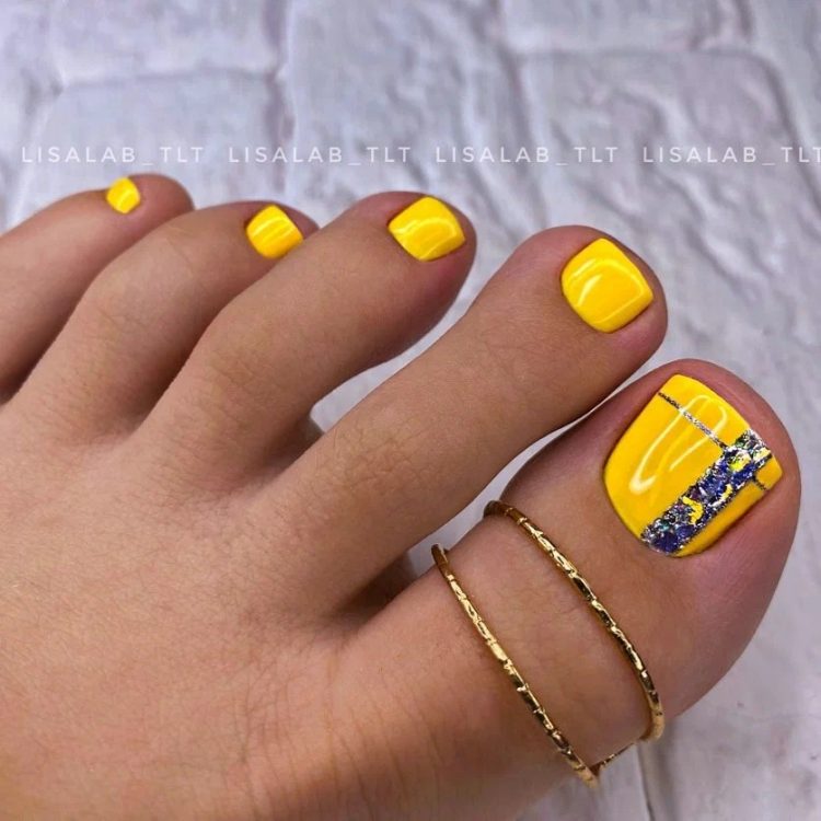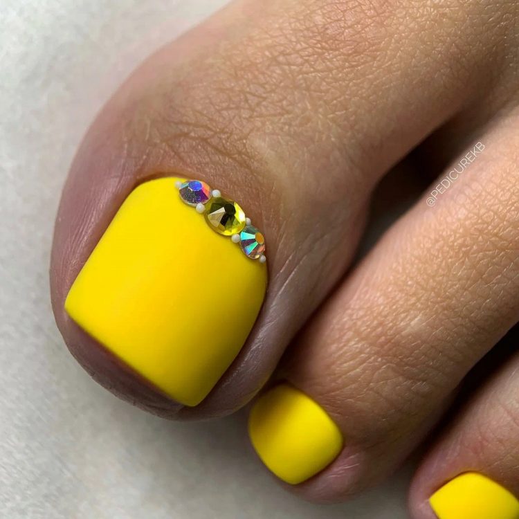 Чи існує ідеальніший колір для створення яскравого літнього педикюру, ніж жовтий? Цього сезону великою популярністю користуються неоново-жовтий та гірчично-жовтий відтінки. Перший ідеально підходить для створення симпатичного дизайну нігтів із милими малюнками на великому пальці. А другий послужить чудовим фоном для шикарного дизайну з матовим покриттям та стразами на великому пальці ноги.