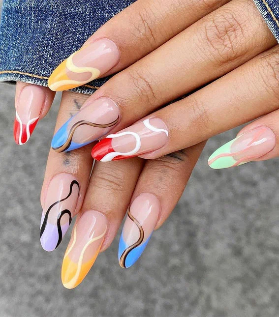 Додайте фарб у ваш образ за допомогою різнокольорових французьких кінчиків та химерних хвилястих ліній. Соковиті відтінки створять безтурботний настрій, а оригінальний візерунок надасть манікюру вишуканості.