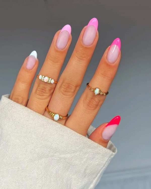 Не можете зупинитися на одному відтінку рожевого? Використовуйте їх усі. Блідо-, карамельно-, яскраво- і темно-рожевий — усі ці кольори будуть у центрі уваги цього незвичайного французького манікюру. Цей ніжний та життєрадісний дизайн чудово впишеться у весняний образ.