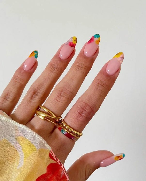 Ефект акварелі завжди створює особливий настрій. Він робить образ ніжним, жіночним та невагомим. Для весни ідеально підійдуть різнокольорові квіткові малюнки, виконані у цій гарній техніці. Такий незвичайний манікюр обов’язково приверне увагу оточуючих.