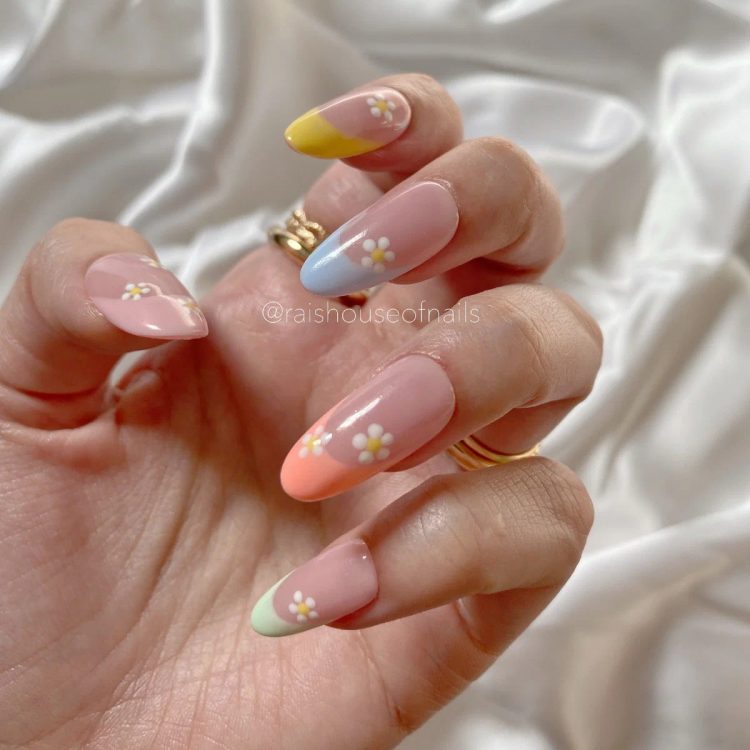 Шукайте симпатичний та милий варіант французького манікюру? Ви точно не помилитеся, якщо виберете цей дизайн у красивих пастельних відтінках з квітковими візерунками. Мініатюрні маргаритки випромінюють радість та весняний настрій.