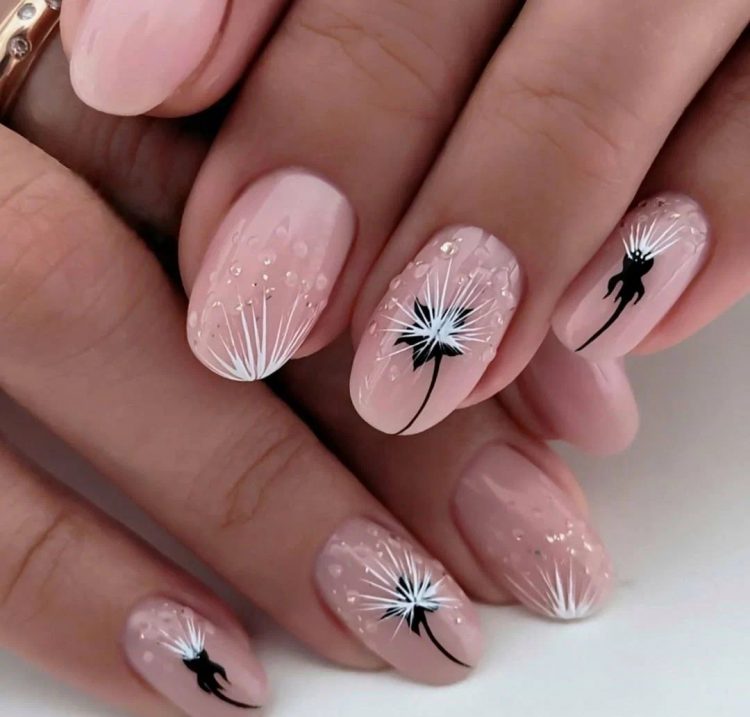 Кульбабу прийнято вважати простою квіткою, що не підходить для складання розкішних букетів. Однак у ній є своя приваблива чарівність. У нейл-арті вона користується величезною популярністю. Можна використовувати її для створення милого дизайну в пастельних відтінках, освіживши малюнок об’ємними краплями, що імітують росу.