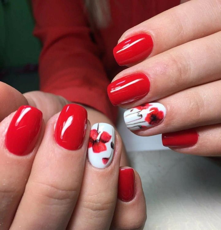 Яскраві маки будуть ефектно виглядати на контрастному світлому фоні. Майстер може використовувати акварельну техніку або зробити малюнки більш графічними. Яскраві маки самі по собі є барвистим акцентом, тому використовувати додатковий декор для того, щоб прикрасити нігті не потрібно.