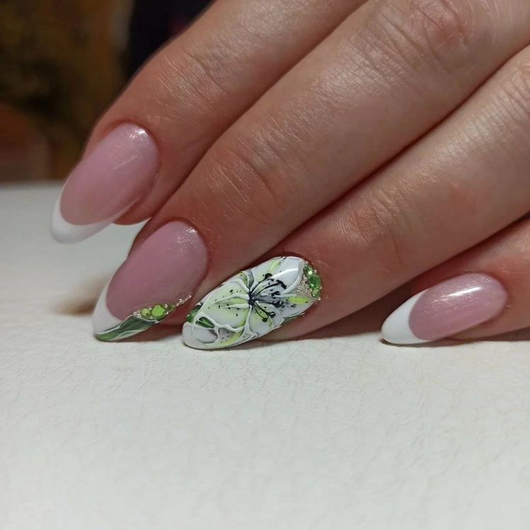 Ніжні квіти лілії – це варіант для романтичних натур. Витончені пелюстки з виділеними білим кольором контурами здатні кардинально змінити нігті будь-якої форми та довжини. Квітами зазвичай прикрашають кілька нігтиків, оскільки малюнок виходить досить об’ємним.