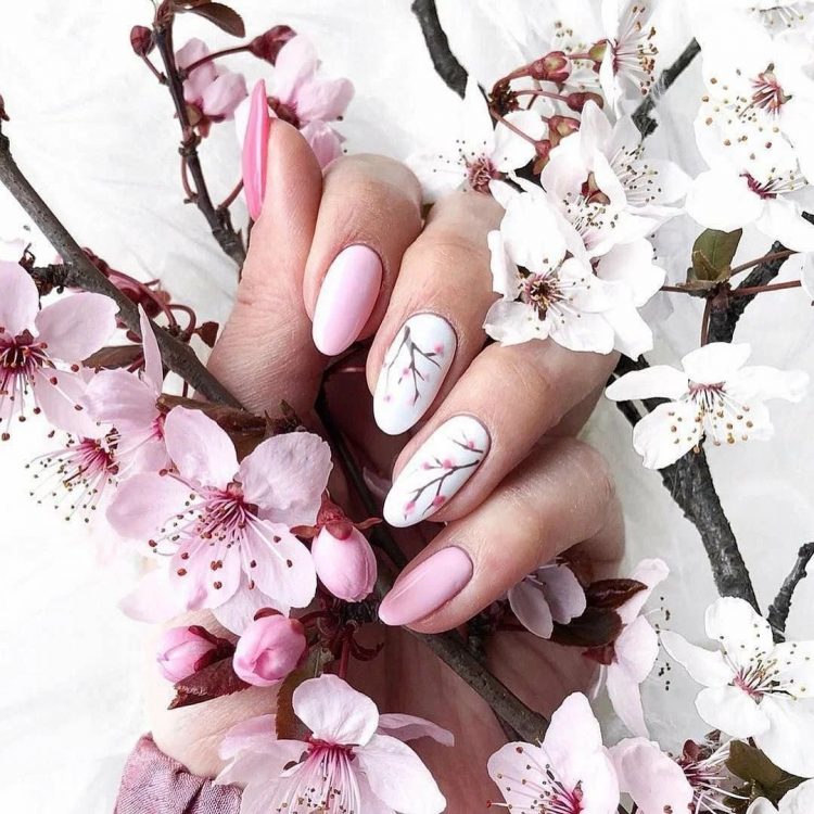 Додати в образ східних ноток допоможуть вишукані квіти вишні. Завдяки невеликому розміру при їхньому промальовуванні не потрібна буде деталізація, тому з таким малюнком впорається навіть новачок.