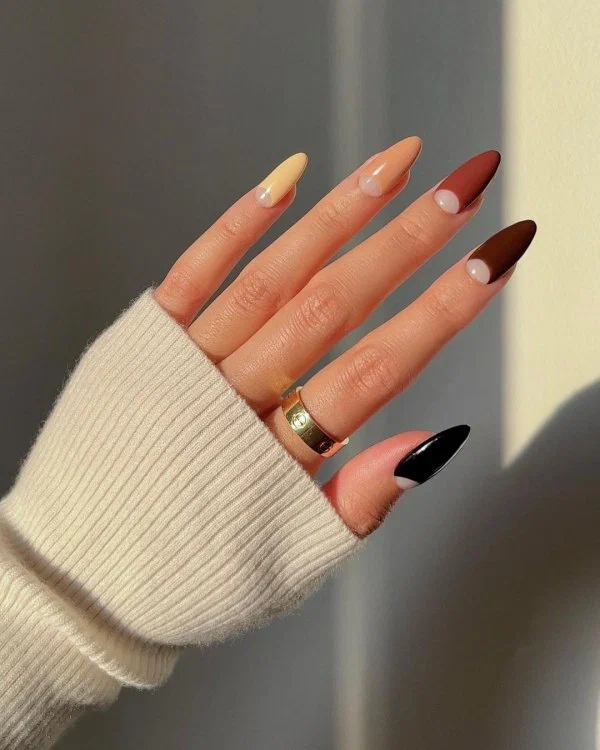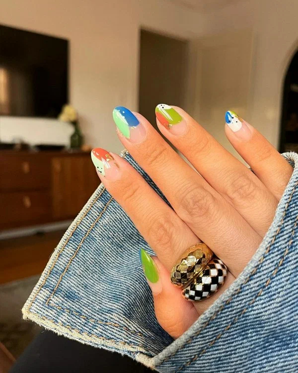 Акцент на кінчику нігтя – хитрий хід, який допоможе відвернути увагу від покриття, що відростає. Абстракція, хвилі, геометрія або орнамент – можна намалювати що завгодно, важливо лише відступити від кутикули 3-5 міліметрів, щоб бежевий ніготь, що відростає, не так кидався в очі.