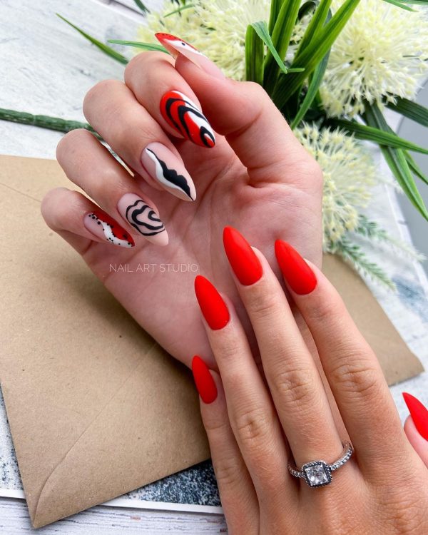 Звичні малюнки на нігтях – це вже надто нудно, тому майстри нейл-арту пропонують модний та яскравий манікюр на осінь з абстрактними візерунками. У цьому дизайні можна вибирати всі відтінки веселки, але для осені краще зупинитися на приглушених і теплих кольорах.