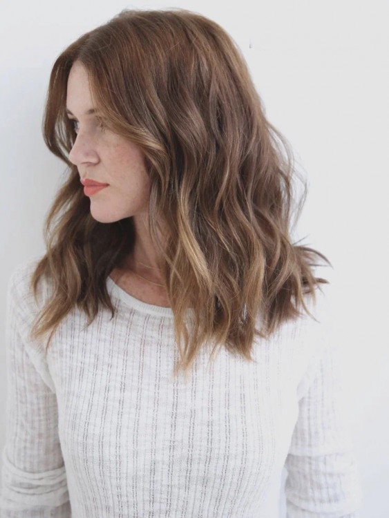 Середня довжина волосся вважається максимально універсальною для красунь усіх вікових категорій. Волосся довжиною до плечей це красиво, комфортно, а також універсально, тому що для нього існує величезна кількість варіантів укладання і зачісок. Перша стрижка, яку варто спробувати модницям з попелясто-коричневими локонами – це волосся довжиною до плечей з ефектними хвилями. Драбинка біля обличчя додає візуальної гармонії жіночому образу.