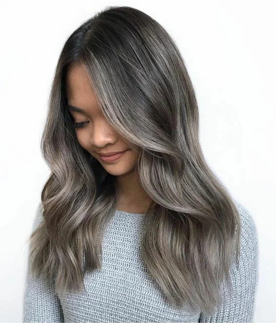 Хвиляста шевелюра середньої довжини з рівним проділом – це ще один чудовий варіант для модниць з темним волоссям попелястого відтінку.