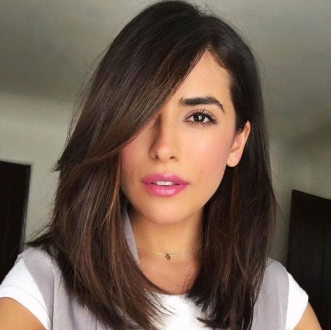 Для ефектного перетворення стилісти пропонують темноволосим красуням стрижку середньої довжини з драбинкою та косим подовженим чубчиком. Легка недбалість дуже підходить цій моделі стрижки.