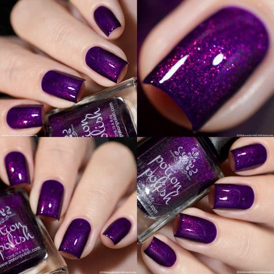 Галактика – це багатогранний, яскравий і виразний колір лаку, який чудово буде перегукуватися з яскравим і виразним літнім вбранням. Насичено-бузковий відтінок з безліччю дрібних блискіток не потребує додаткового дизайну.